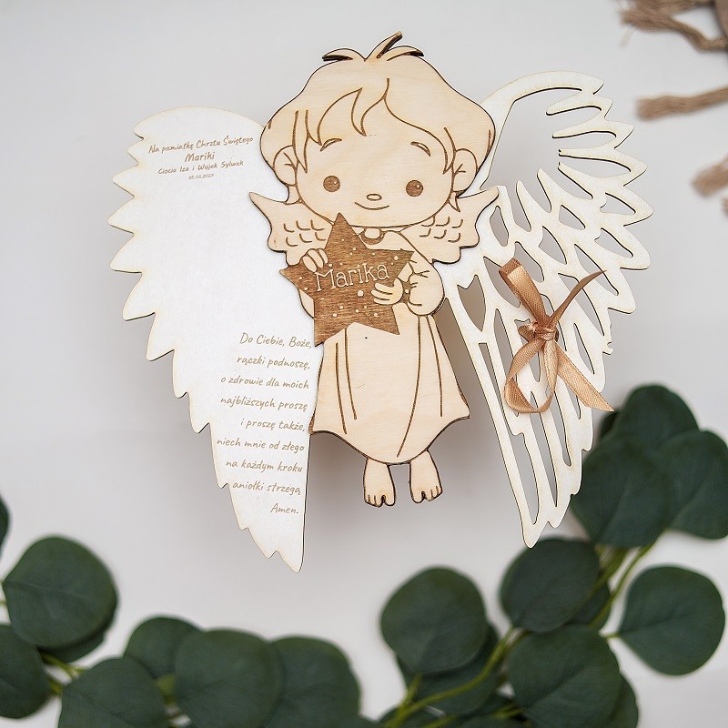 Nie zapomnij zapisać swojej personalizacji, aby móc dodać ją do koszykaAnioł Stróż – drewniany aniołek z modlitwą to spokojna, symboliczna pamiątka dla dziecka.