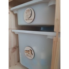 Drewniane piktogramy świetnie kontrastują z białymi lub kolorowymi pojemnikami i sprawiają, że cały regał jest uporządkowany.