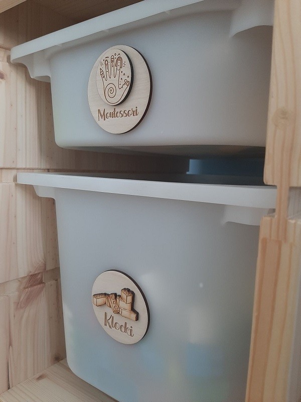 Te drewniane etykiety z piktogramami idealnie wpisują się w założenia organizacji Montessori – czyli porządek, widoczność i samodzielność dziecka.
