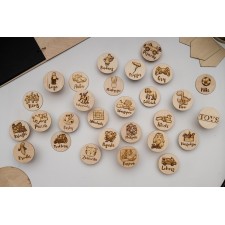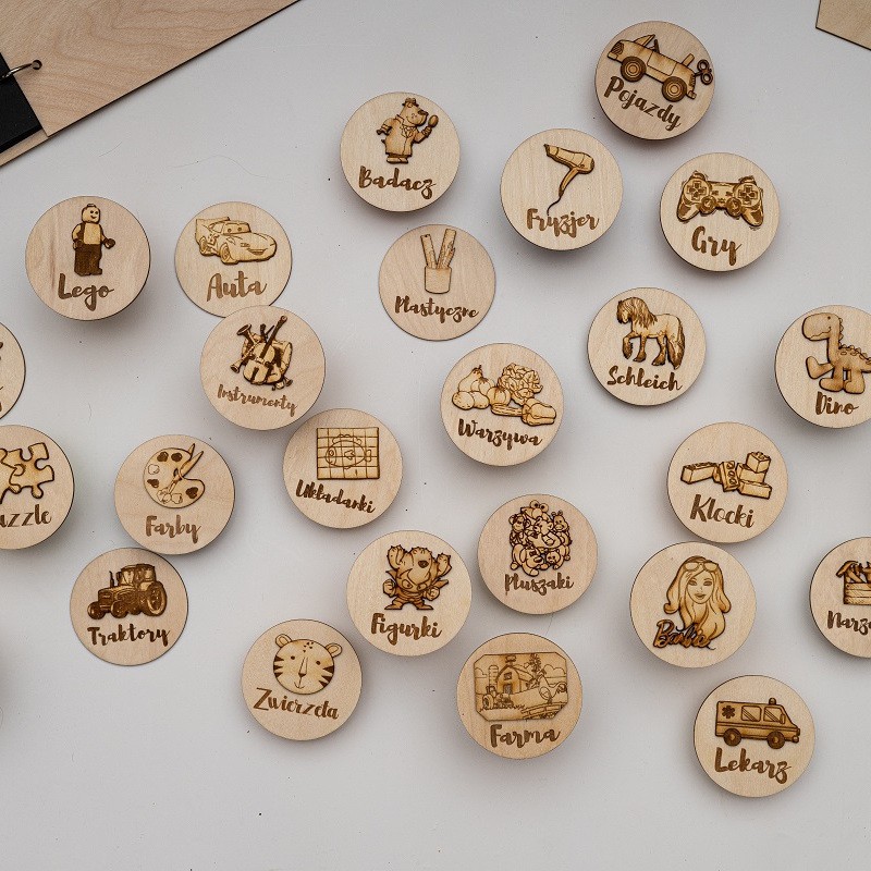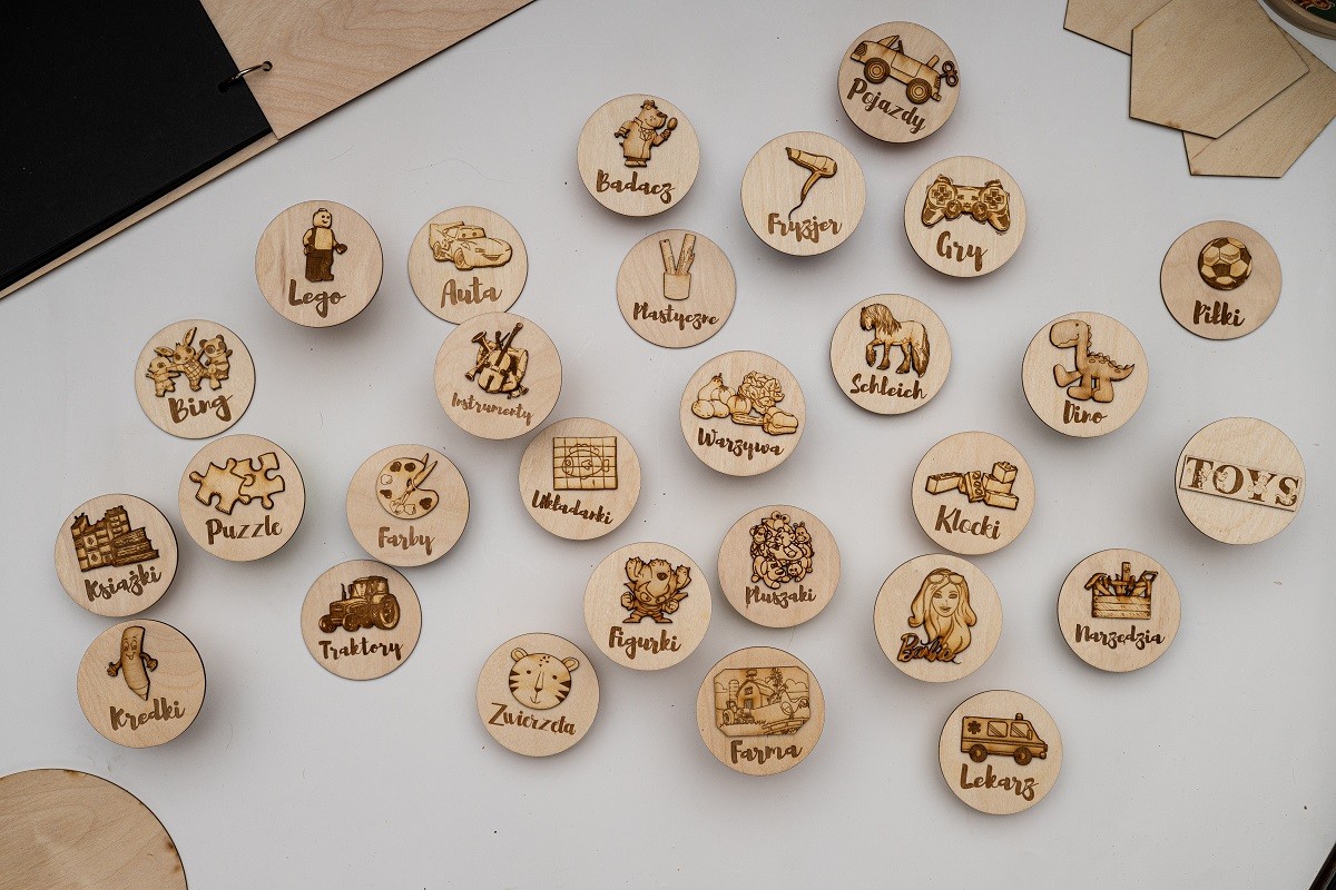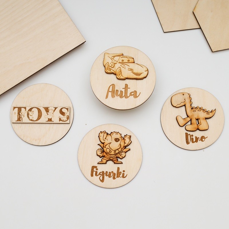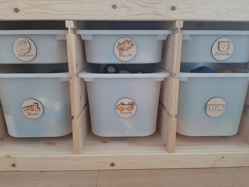 Drewniane etykiety na pudełka z zabawkami – piktogramy do segregacji