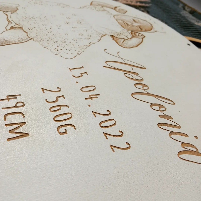 Wyjątkowa personalizowana metryczka z grawerowanym zdjęciem niemowlaka, wykonana ze sklejki o grubości 3 mm i malowana na biało farbą bezpieczną dla dzieci. To piękna pamiątka narodzin dziecka, która doskonale sprawdzi się jako prezent z okazji narodzin, chrztu lub baby shower.