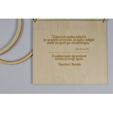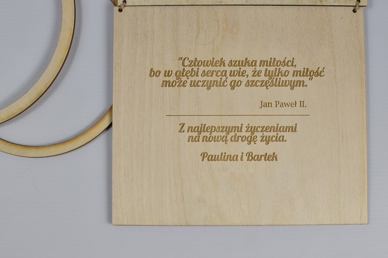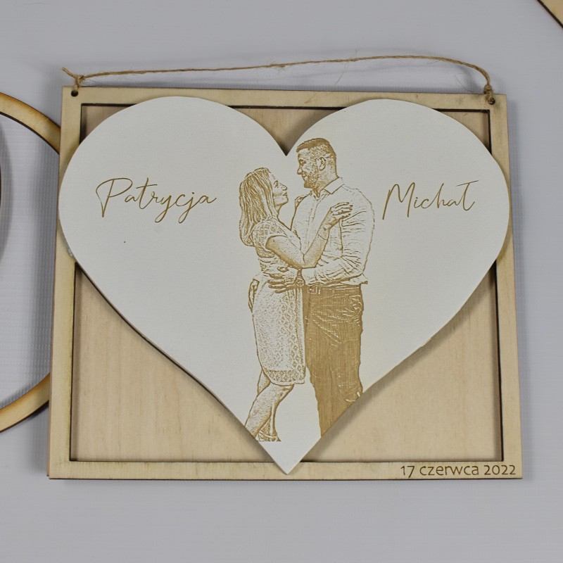 Zdjęcie Młodej Pary jest grawerowane laserowo w drewnie – to nie nadruk, nie naklejka, tylko trwały, głęboki ryt, który nie znika z czasem.